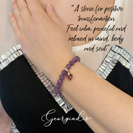 8mm Amethyst Bracelet for Women, Austrian Crystal Heart Charm, 18K Gold Plated Bail, Calming Healing Gemstone Jewelry, Purple Colour Therapy, February Birthstone Gift, Love & Spiritual Awareness