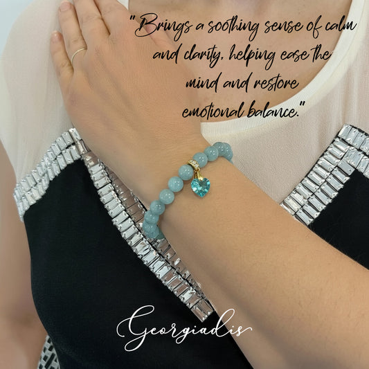 8mm Aquamarine Bracelet for Women with Austrian Crystal Heart Charm, 18K Gold Plated, Healing Stone for Calm & Clarity, March Birthstone, Gift, Bracelet For Women