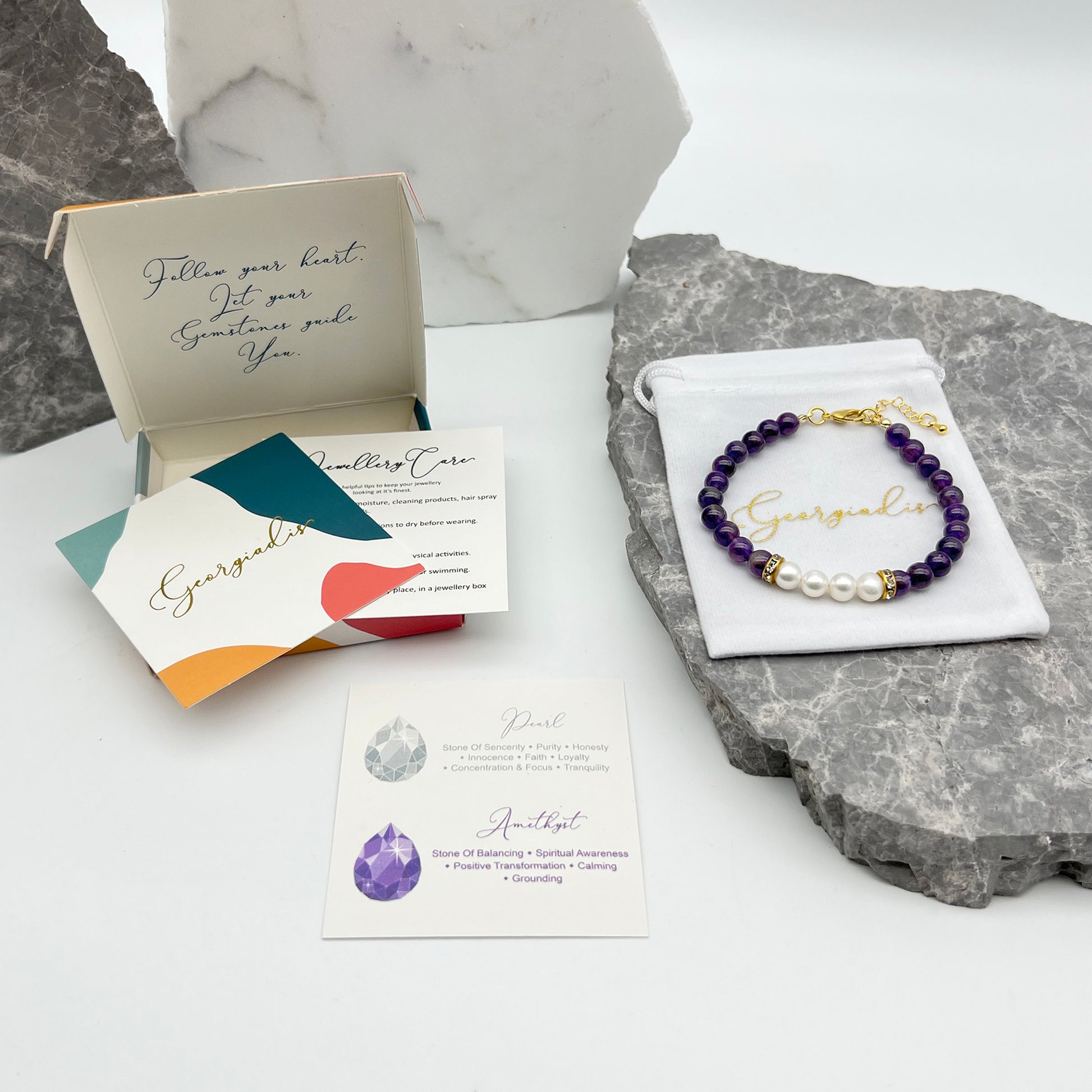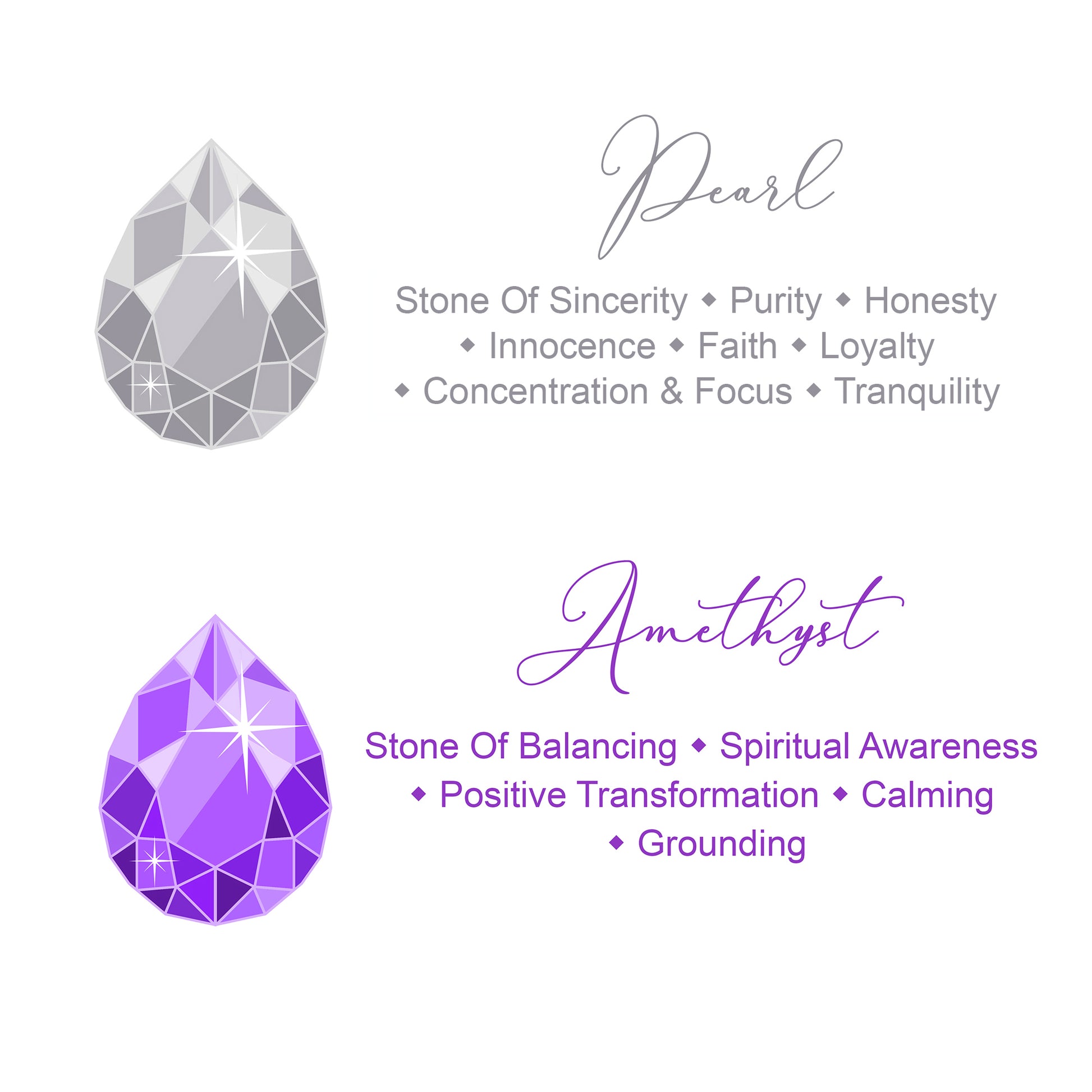 💎 JEWELRY INFO CARDS 💎 - Beautifully designed cards explain the many natural benefits of Pearls and Amethyst along with tips for proper care of your bracelet. It will become a frequent inspiration for positive energy and a more meaningful life.